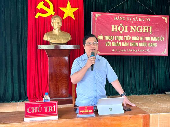 Chiều ngày 29/9/2025, đồng chí Phạm Giang Nam, Bí thư Đảng ủy - Chủ tịch HĐND xã Ba Tơ đã đối thoại trực tiếp với nhân dân thôn Nước Đang. Cùng tham dự tại buổi đối thoại có đồng chí Trần Thanh Hoài, UVBTV, Phó Chủ tịch UBND xã, lãnh đạo các cơ quan tham mưu giúp việc Đảng ủy và nhân dân thôn Nước Đang.