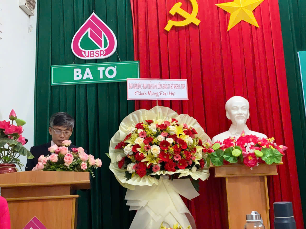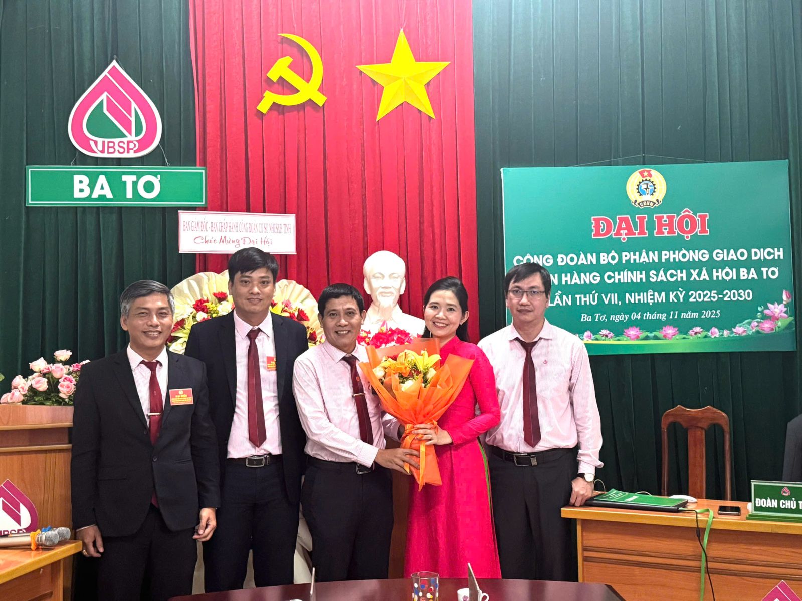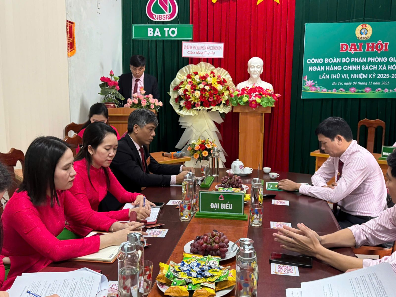 Sáng ngày 04/11/2025, Công đoàn bộ phận Phòng giao dịch Ngân hàng Chính sách xã hội (NHCSXH) Ba Tơ tổ chức Đại hội Công đoàn lần thứ VII, nhiệm kỳ 2025 - 2030. Dự và chỉ đạo Đại hội có đồng chí Trần Duy Cường - Phó Giám đốc chi nhánh - Chủ tịch Công đoàn cơ sở chi nhánh NHCSXH tỉnh Quảng Ngãi; Đ/c Trần Thanh Hoàng - Bí thư Chi bộ - Giám đốc Phòng giao dịch NHCSXH Ba Tơ cùng toàn thể cán bộ, đoàn viên, người lao động trong đơn vị.