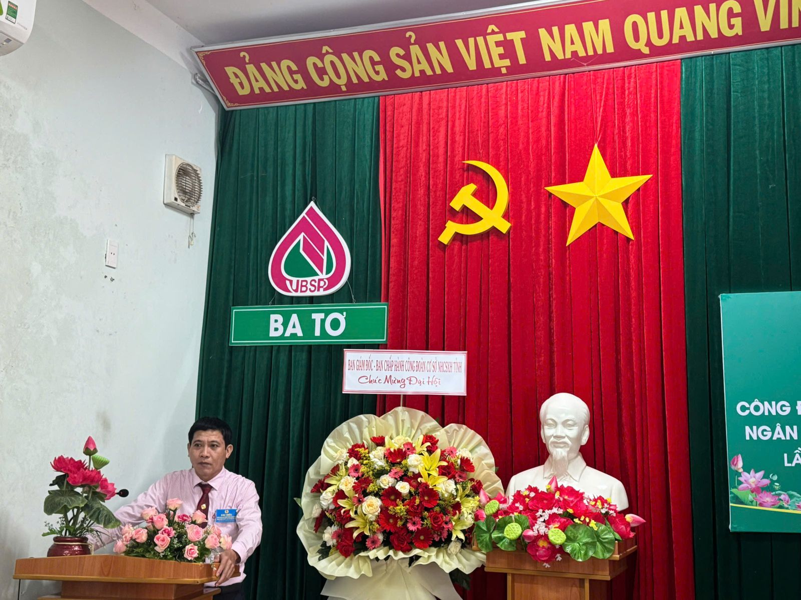 Phát biểu chỉ đạo tại Đại hội, đồng chí Trần Duy Cường - Phó Giám đốc chi nhánh - Chủ tịch Công đồng cơ sở chi nhánh NHCSXH tỉnh Quảng Ngãi mong muốn Công đoàn bộ phận Phòng giao dịch NHCSXH Ba Tơ tiếp tục phát huy truyền thống đoàn kết, đổi mới nội dung và phương thức hoạt động, gắn với chuyển đổi số và cải cách hành chính; tăng cường ứng dụng công nghệ thông tin trong công tác quản lý, điều hành; nâng cao năng lực đội ngũ cán bộ công đoàn; chăm lo tốt hơn đời sống vật chất, tinh thần cho đoàn viên, người lao động góp phần hoàn thành Nghị quyết Đại hội Chi bộ Phòng giao dịch NHCSXH Ba Tơ và thực hiện tốt vai trò của NHCSXH trong việc đóng góp tích cực thực hiện 03 Chương trình mục tiêu Quốc gia về giảm nghèo bền vững, xây dựng nông thôn mới và phát triển kinh tế - xã hội vùng đồng bào dân tộc thiểu số giai đoạn 2021 - 2030, giai đoạn I: từ năm 2021 - 2025 và Chiến lược phát triển NHCSXH giai đoạn 2021 - 2030 tại địa phương./.