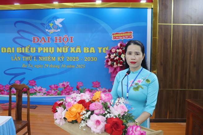 Sáng ngày 29/10/2025, tại Hội trường Đảng ủy xã, Hội Liên hiệp phụ nữ (LHPN) xã Ba Tơ tổ chức Đại hội lần thứ I, nhiệm kỳ 2025 - 2030. Tham dự tại Đại hội về phía Hội LHPN tỉnh có đồng chí Nguyễn Thị Lan, Phó Chủ tịch UBMTTQVN tỉnh, Chủ tịch Hội LHPN tỉnh; về phía xã Ba Tơ có các đồng chí Phạm Văn Chiêng, Phó Bí thư Thường trực Đảng ủy xã; đồng chí Đinh Trọng Thành, Phó Bí thư, Chủ tịch UBND xã; đồng chí Đinh Y Nam, UVBTV, Phó Chủ tịch HĐND xã; đồng chí Phạm Thị Hà, UVBTV, Chủ tịch UBMTTQVN xã và 129 đại biểu đại diện cho hơn 2.515 hội viên phụ nữ trong toàn xã.